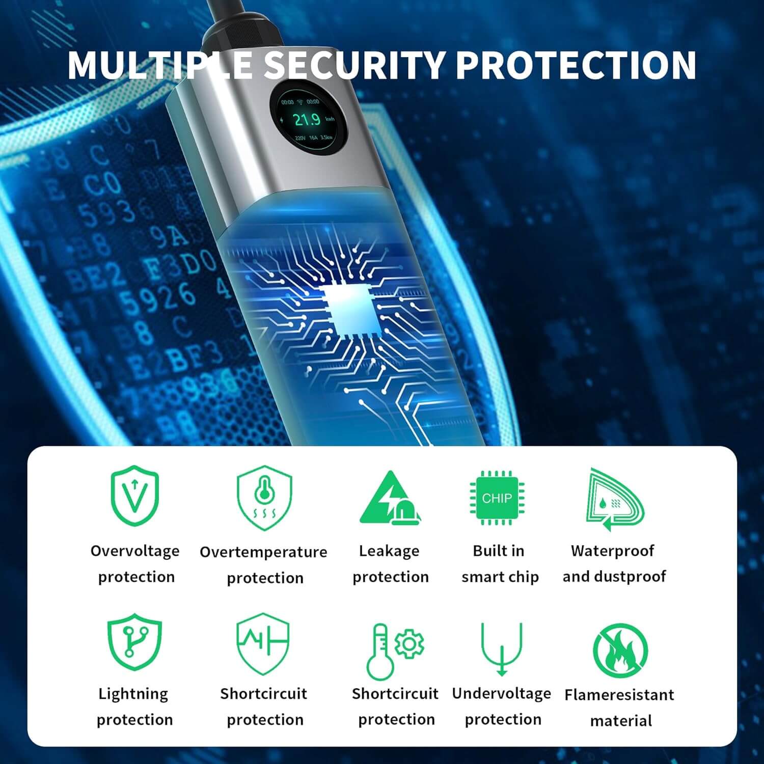 [Plus sécuritaire] La sécurité est la clé. Nous avons équipé le chargeur d’une électronique avancée qui surveille en permanence les paramètres de charge de votre voiture. Une protection contre les surtensions, une protection contre les sous-tensions, une protection contre les fuites, une protection contre la surchauffe. Le boîtier est extrêmement durable, étanche.
